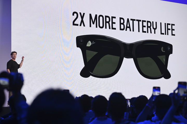 [멘로파크=AP/뉴시스] 마크 저커버그 메타 최고경영자(CEO)가 17일(현지 시간) 미 캘리포니아주 멘로파크에서 열린 개발자 콘퍼런스 '커넥트'에서 신형 스마트 안경을 공개하고 있다. 2025.09.18. |
