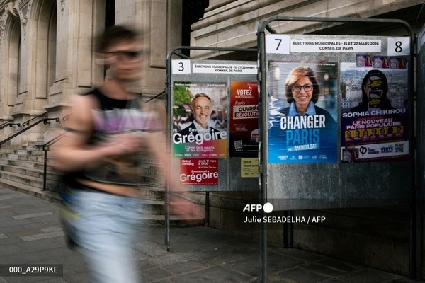(프랑스=국제뉴스) 김현승 기자 = 6일(현지시간) 프랑스 파리 시장 선거 1차 투표(3월 15일)를 앞두고 한 사람이 파리 7구청 앞 선거 안내판 옆을 지나가고 있다.