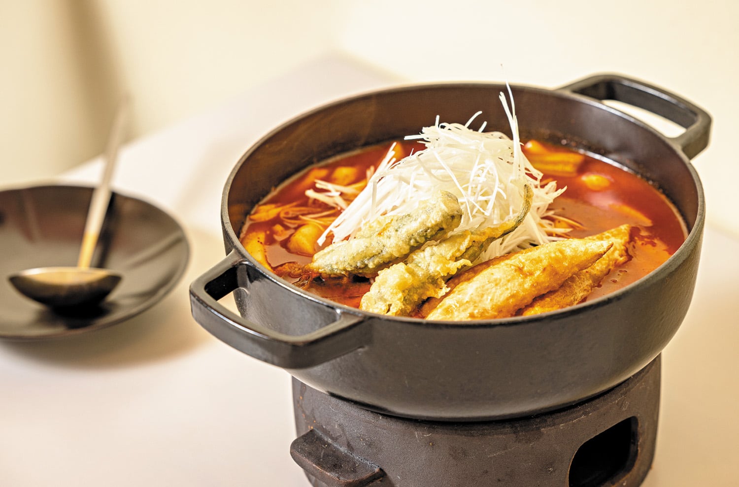 마늘종 고추튀김은 큼지막하게 튀겨 섬세하게 먹기 좋은 크기로 잘랐다. 독한 매운맛은 빼고 마늘종의 달고 매콤한 기운과 돼지고기의 기름진 단맛만 잘 추려서 아삭한 고추 안에 들어가 있었다. 칼로 다진 듯 이에 씹히는 감각이 톡톡거렸던 만두는 공장에서 만든, 이겨지고 짓이겨진 완자 같은 질감의 것이 아니었다. 도톰한 만두피와 힘을 겨루듯 울룩불룩 근육처럼 가득 들어찬 소가 만두라는 팽팽한 하나의 세계를 만들었다. 마지막으로 주물 냄비 가득 주홍색 떡볶이가 나왔을 때 익숙한 냄새와 모습에 30여 년 전 풍경이 들이닥쳤다. 매끈한 밀떡은 혀와 이에 닿자마자 작은 물고기처럼 파닥였다. 채소와 멸치를 끓여 낸 육수는 그윽하고 아득하게 맛의 지평을 저 멀리로 끌고 나갔다.