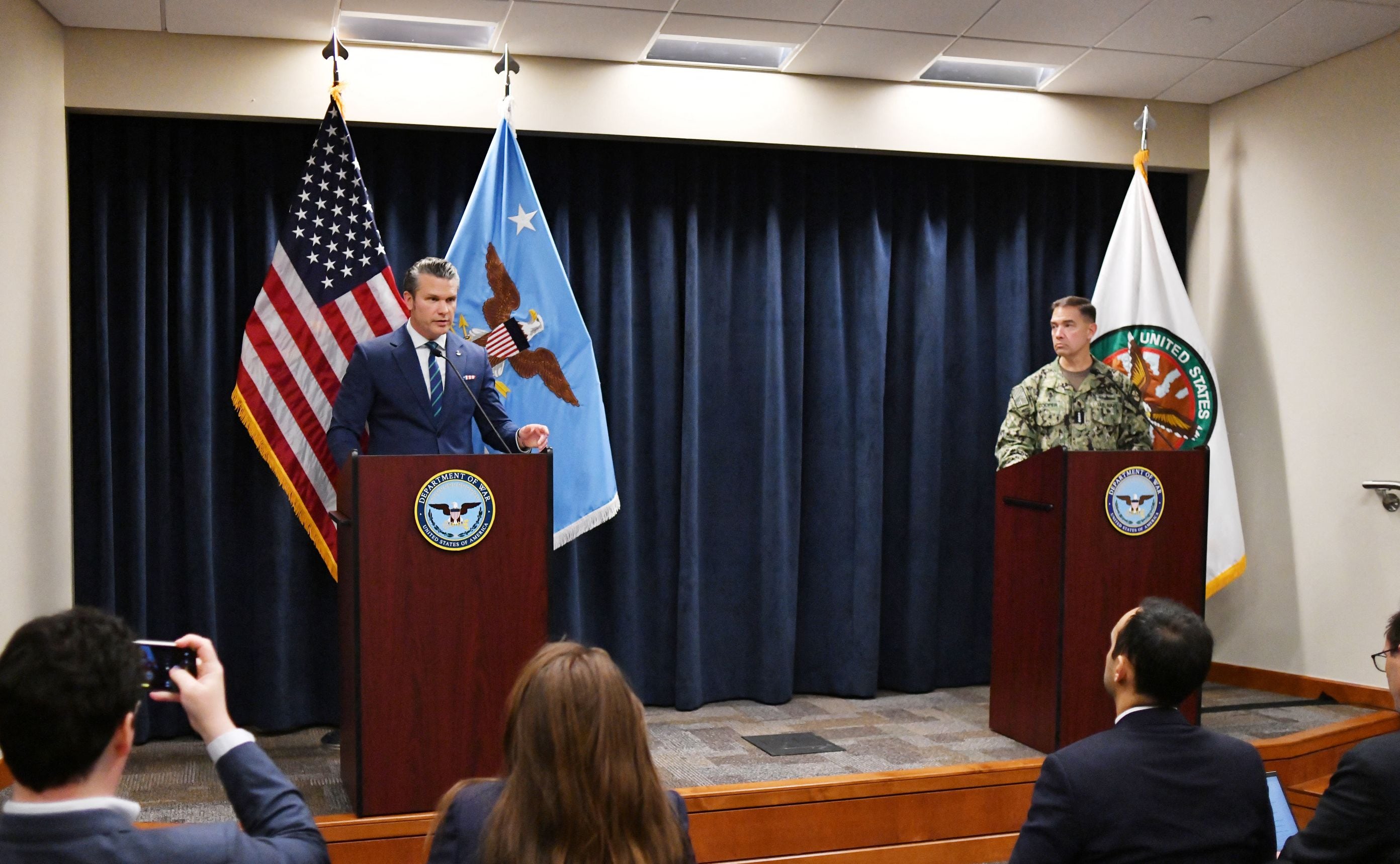 피트 헤그세스 미 국방장관(왼쪽)과 브래드 쿠퍼 중부사령관이 5일 플로리다주 중부사령부(CENTCOM) 본부에서 공동 기자회견을 하고 있다. /AFP 연합뉴스 |