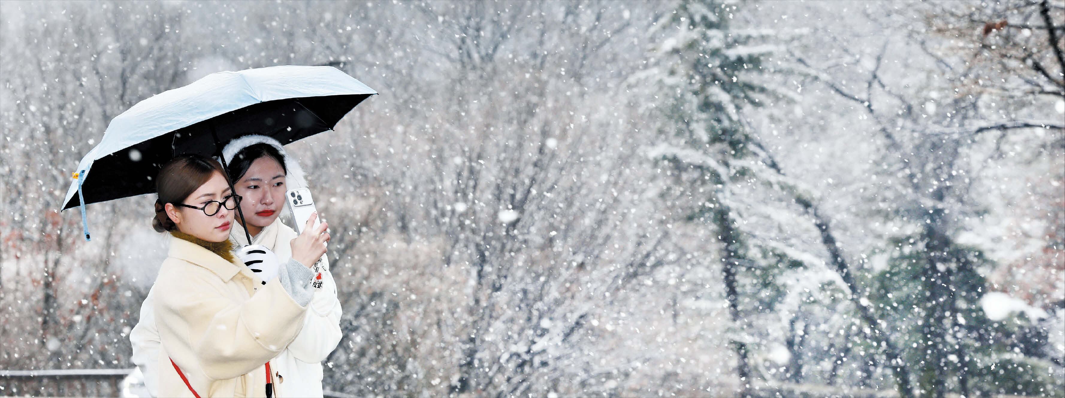 서울에 눈이 내린 6일 오전 중구 남산에서 외국인 관광객들이 우산을 들고 기념 사진을 찍고 있다. 기상청에 따르면, 토요일인 7일엔 비와 눈이 그치고 북쪽에서 찬 공기가 내려오면서 전국의 아침 기온이 5~10도가량 떨어지겠다. 전국 아침 최저기온은 영하 8~영상 1도, 낮 최고기온은 영상 4~10도로 예보됐다. 일요일인 8일 역시 아침 최저기온은 영하 7~영상 1도, 낮 최고기온은 영상 6~12도로 쌀쌀하지만 대체로 맑은 날씨가 이어질 전망이다. 봄 추위는 9일부터 서서히 풀릴 것으로 보인다.