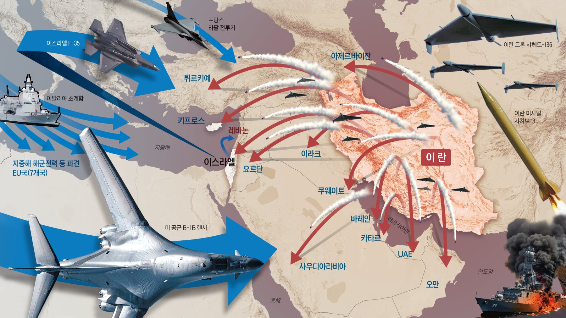 결국 유럽 주요국들은 자국민 보호와 방공망 강화를 명분으로 중동 군사 개입을 공식화했다. 조르자 멜로니 이탈리아 총리는 5일 “동맹국인 걸프 국가와 교민, 2000명의 이탈리아 군인 보호를 위해 방공 분야 지원에 나설 것”이라고 밝혔다. 스페인과 네덜란드 역시 이탈리아와 함께 방공 임무를 맡을 해군 전력을 키프로스에 파견하기로 했다. 앞서 프랑스는 자국 기지에 미군 항공기 주둔을 일시 허용하고 중동 지역에 라팔 전투기를 동원했으며, 영국은 방어 작전 강화를 위해 카타르에 타이푼 전투기 4대를 추가 배치하기로 했다. 독일 역시 이란의 역내 공격에 유감을 표명했다.