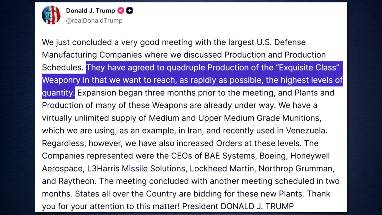 트럼프 대통령은 미국 방산업체들이 "우리가 최대한 신속하게 최대 생산량에 도달하기는 원하는 최상급 무기 생산을 4배로 늘리기로 합의했다"고 밝혔습니다.