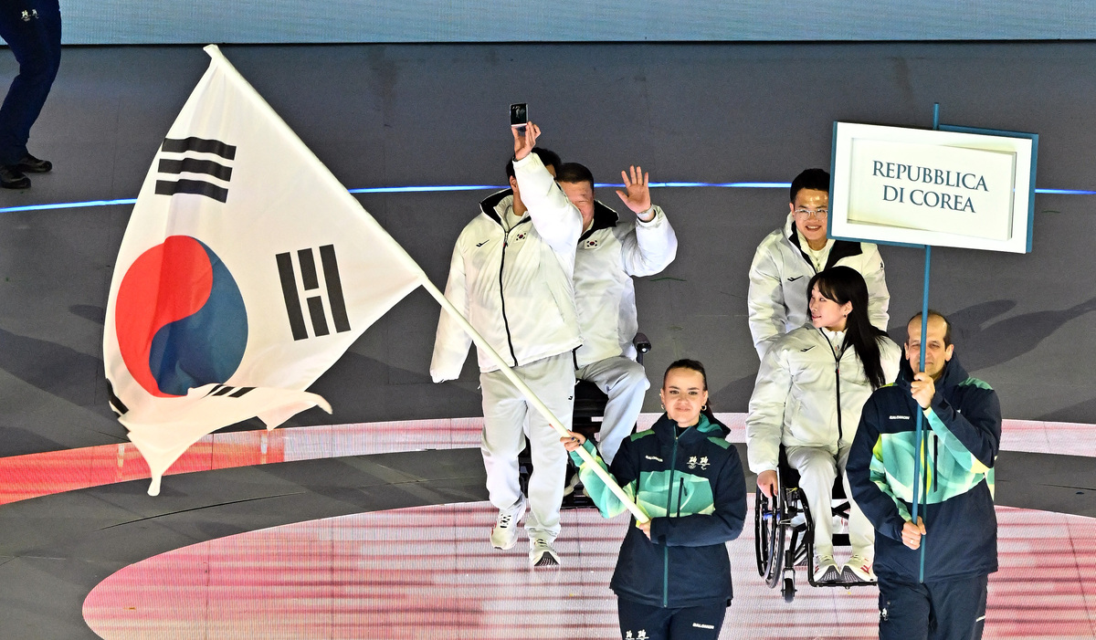6일(현지시간) 이탈리아 아레나 디 베로나에서 열린 2026 밀라노 코르티나 동계패럴림픽 개회식에서 한국 선수단(양오열 선수단장, 전선주 총감독, 스노보드 이충민, 알파인스키 박채이)이 입장하고 있다. 베로나=김두홍 기자 kimdh@sportsworldi.com 2026.03.07.