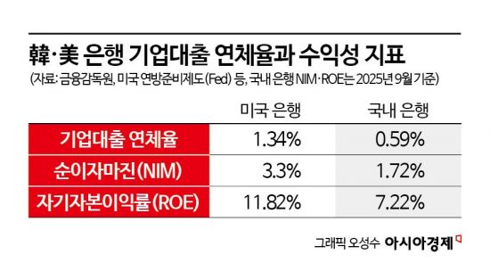 같은 시점 미국 상업은행의 기업대출 연체율은 국내보다 훨씬 높은 수준이었다. 미국 연방준비제도(Fed) 집계 기준 미 상업은행의 기업대출 연체율은 2025년 말 1.34%로 국내 은행의 두 배를 크게 웃돌았다.