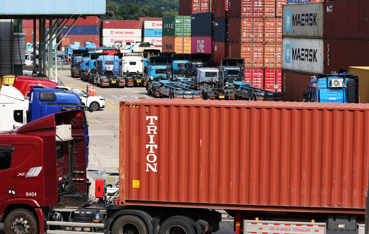 중동전쟁으로 인한 기름값 급등으로 화물차 기사들의 고충이 커지고 있다. 사진은 경기도 의왕시 내륙컨테이너기지(ICD)에서 쌓여있는 컨테이너 옆에 화물차들이 멈춰 서 있는 모습. [연합] |