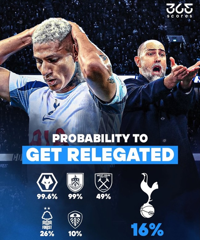 "설마?"라고 말하기엔 매우 심각하다. 토트넘은 16위인데 강등권인 18위 웨스트햄 유나이티드와 승점 1 차이가 난다. 17위 노팅엄 포레스트는 비토르 페레이라 감독을 선임하면서 반등을 꾀하고 있다. 19위 번리, 20위 울버햄튼과 차이가 나는데 노팅엄, 웨스트햄과는 매우 근접하다. 향후 몇 경기 결과에 따라 토트넘이 18위로 내려갈 수 있다.