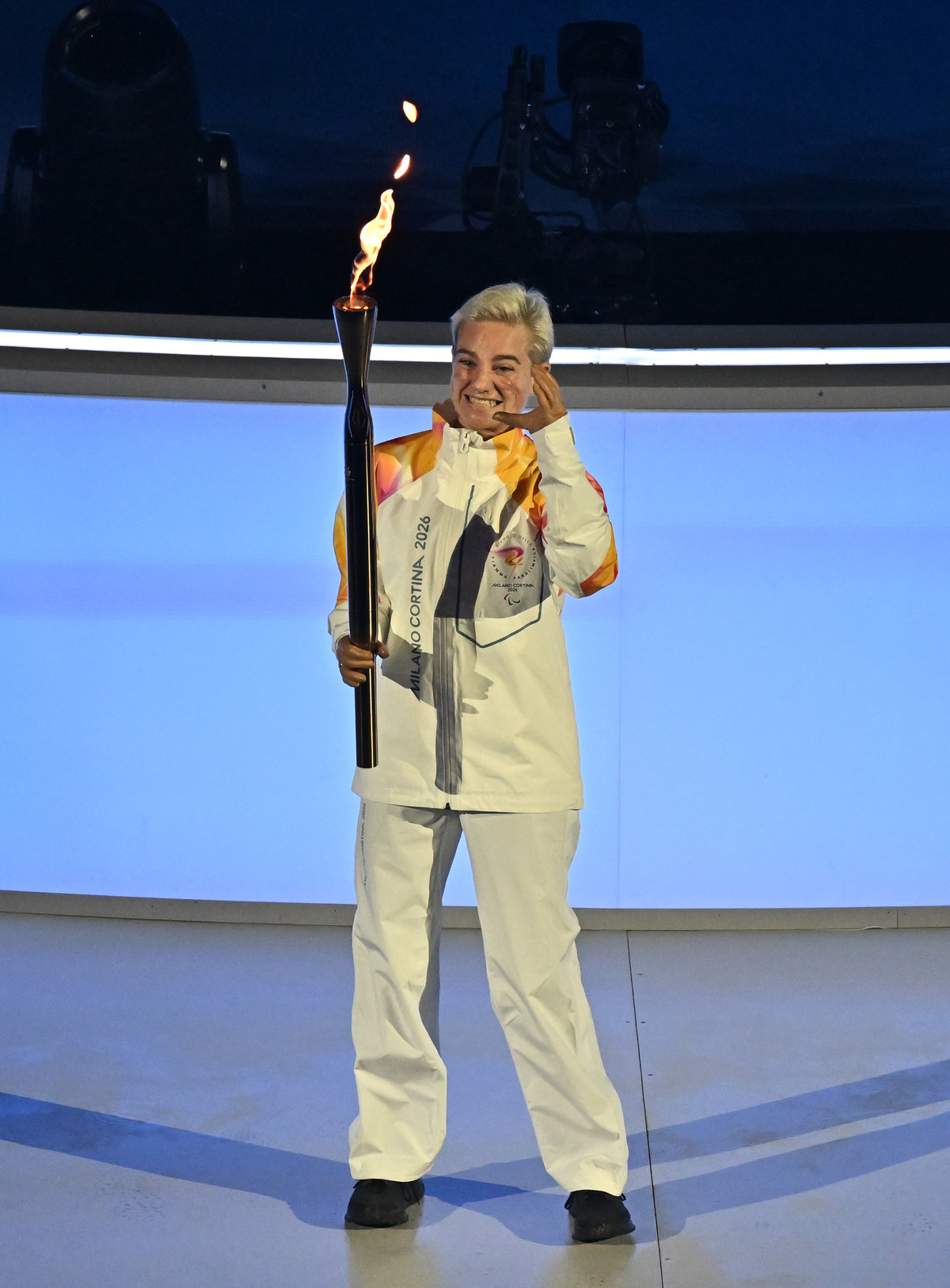 6일(현지시간) 이탈리아 아레나 디 베로나에서 열린 2026 밀라노 코르티나 동계패럴림픽 개회식에서 펜싱스타 베베 비오가 마지막 성화주자로 등장하고 있다. 베로나=김두홍 기자 kimdh@sportsworldi.com 2026.03.07.