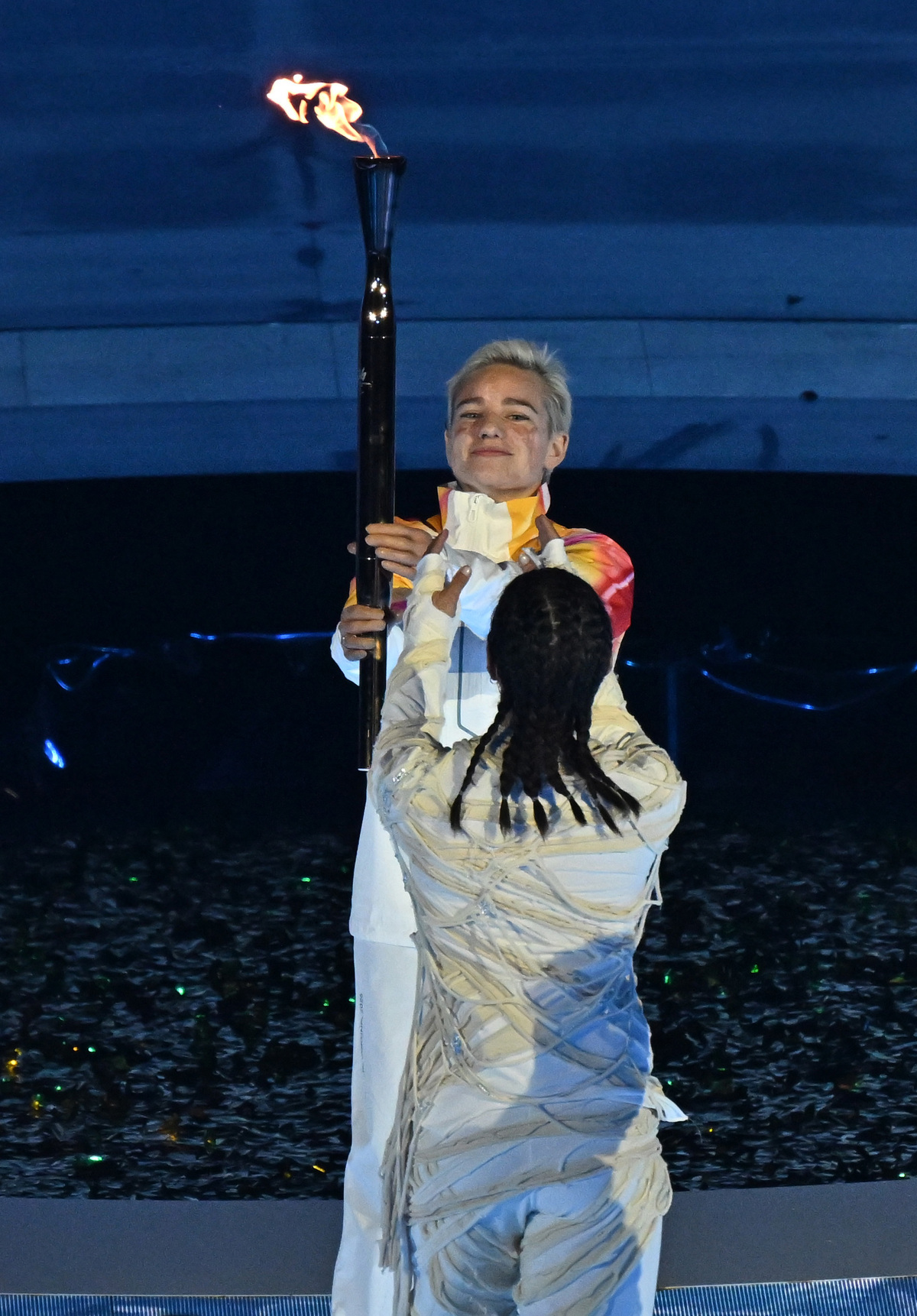 6일(현지시간) 이탈리아 아레나 디 베로나에서 열린 2026 밀라노 코르티나 동계패럴림픽 개회식에서 펜싱스타 베베 비오가 마지막 성화주자로 등장하고 있다. 베로나=김두홍 기자 kimdh@sportsworldi.com 2026.03.07.