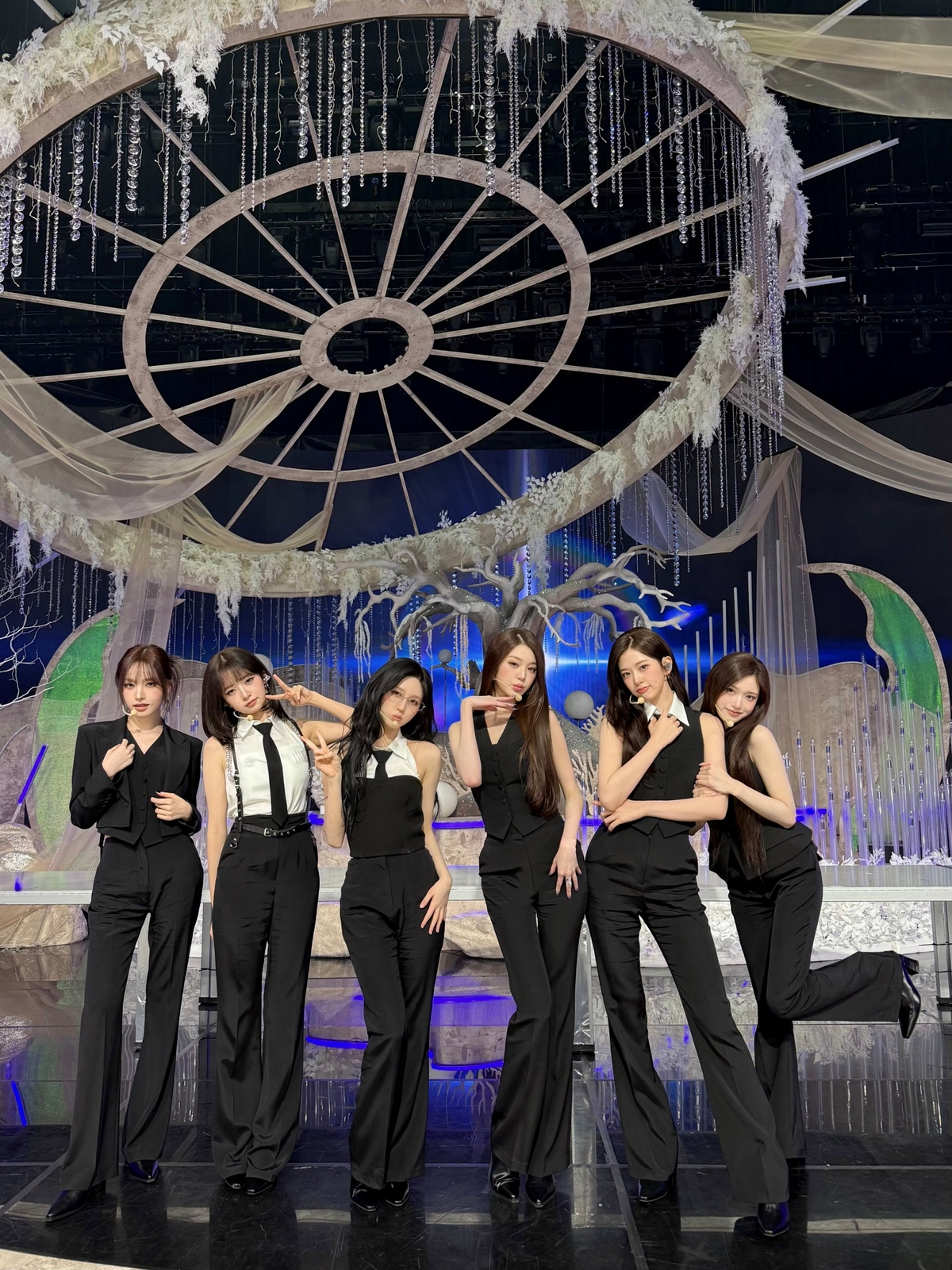 이날 방송에서 아이브는 신곡 ‘블랙홀’ 무대를 선보이며 강렬한 존재감을 드러냈다. 6인 6색의 수트 스타일링으로 등장한 아이브는 긴 테이블을 활용한 역동적인 퍼포먼스로 무대의 몰입도를 높였고, 멤버들의 카리스마 넘치는 군무와 귓가를 사로잡는 매력적인 보컬이 어우러지며 현장의 분위기를 압도했다. 특히, 포인트 안무를 활용한 ‘룩앳미’ 춤을 비롯해 생동감 넘치는 표정이 몰입도를 배가시켰다.