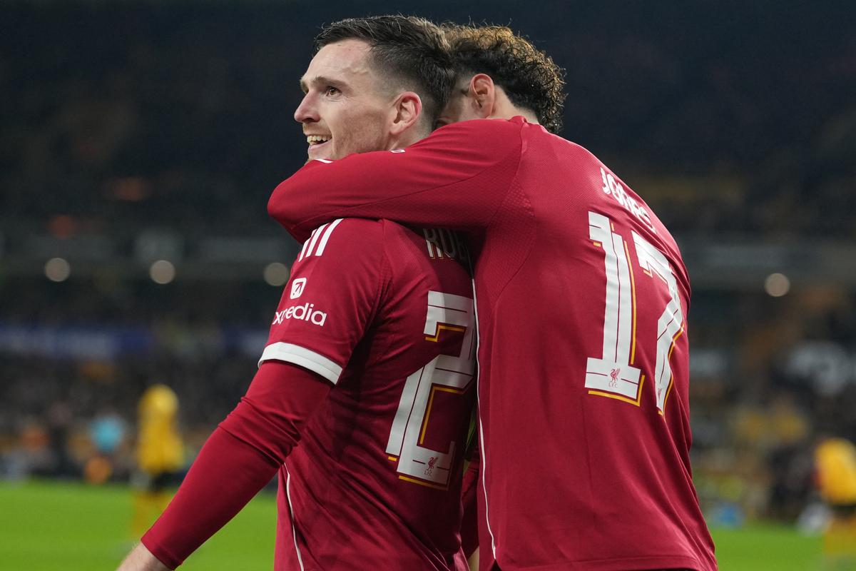 앤드루 로버트슨이 7일 영국 울버햄프턴의 몰리뉴 스타디움에서 열린 울버햄프턴과 2025~2026 잉글랜드축구협회컵 16강전에서 골을 넣은 뒤 동료와 기뻐하고 있다. 울버햄프턴 | AP연합뉴스 |