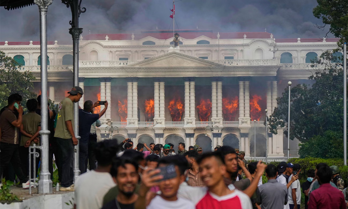 지난 2025년 9월9일(현지시간) 네팔 수도 카트만두 싱하 두르바르 궁전이 정부의 사회관계망서비스(SNS) 차단 조치에 격분한 Z세대 시위대로 인해 화염에 휩싸인 모습. 카트만두=AP연합뉴스