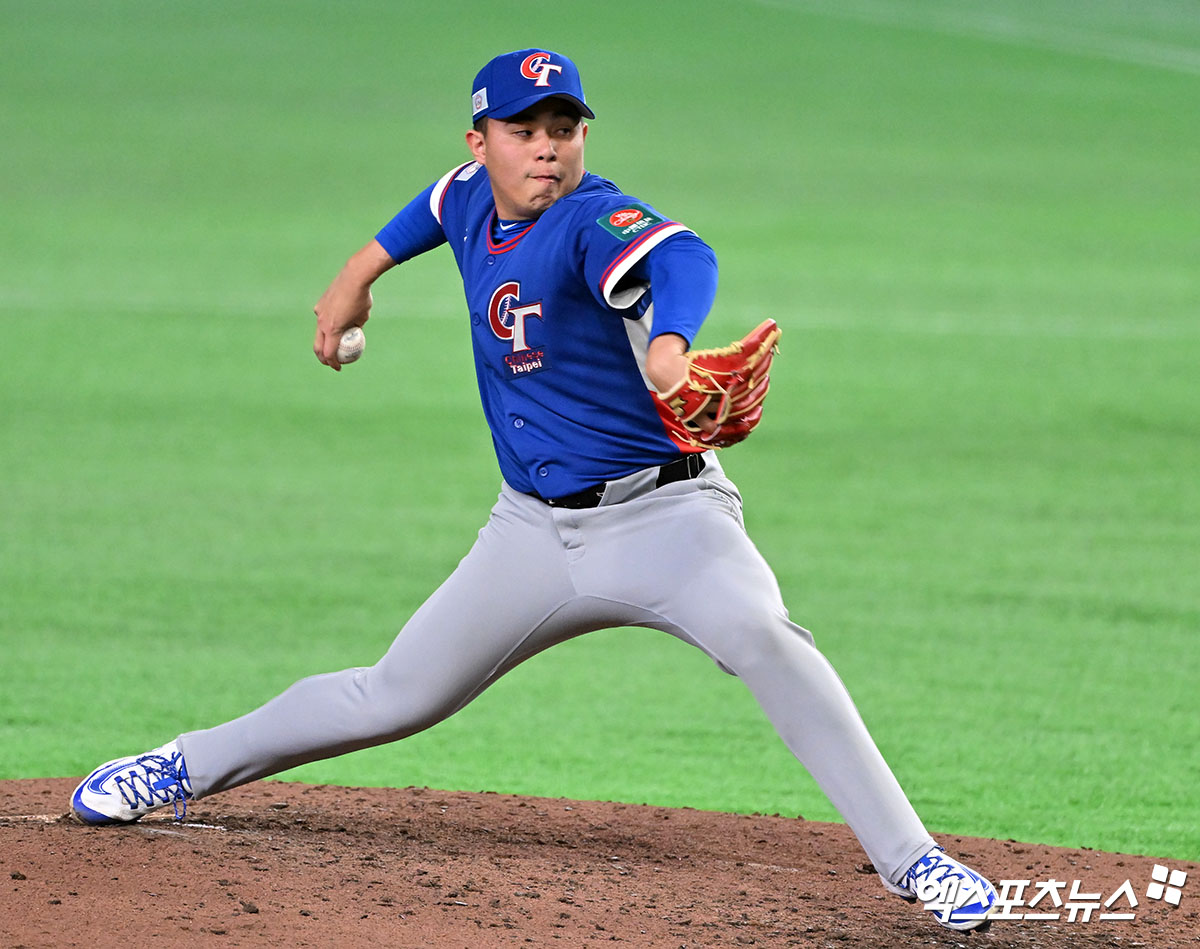 (엑스포츠뉴스 도쿄(일본), 김한준 기자) 7일 오후 일본 도쿄돔에서 열린 2026 월드베이스볼클래식(WBC) C조 대만과 체코의 경기, 7회초 대만 쩡진위에가 공을 힘차게 던지고 있다.