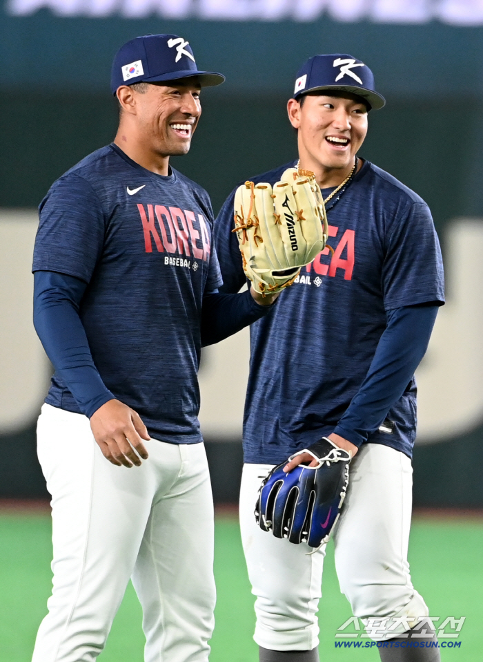 7일 일본 도쿄돔에서 열린 WBC(월드베이스볼클래식) 한국과 일본의 경기. 경기 전 자마이 존스와 안현민이 이야기를 나누고 있다. 도쿄(일본)=허상욱 기자wook@sportschosun.com/2026.03.07/ |