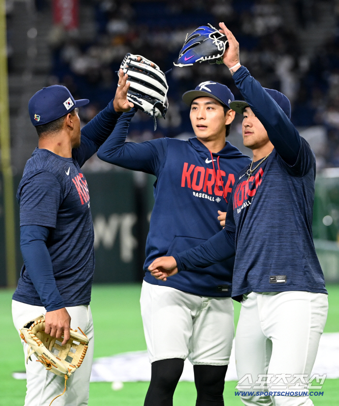 7일 일본 도쿄돔에서 열린 WBC(월드베이스볼클래식) 한국과 일본의 경기. 경기 전 자마이 존스, 이정후, 안현민이 하이파이브를 하고 있다. 도쿄(일본)=허상욱 기자wook@sportschosun.com/2026.03.07/ |