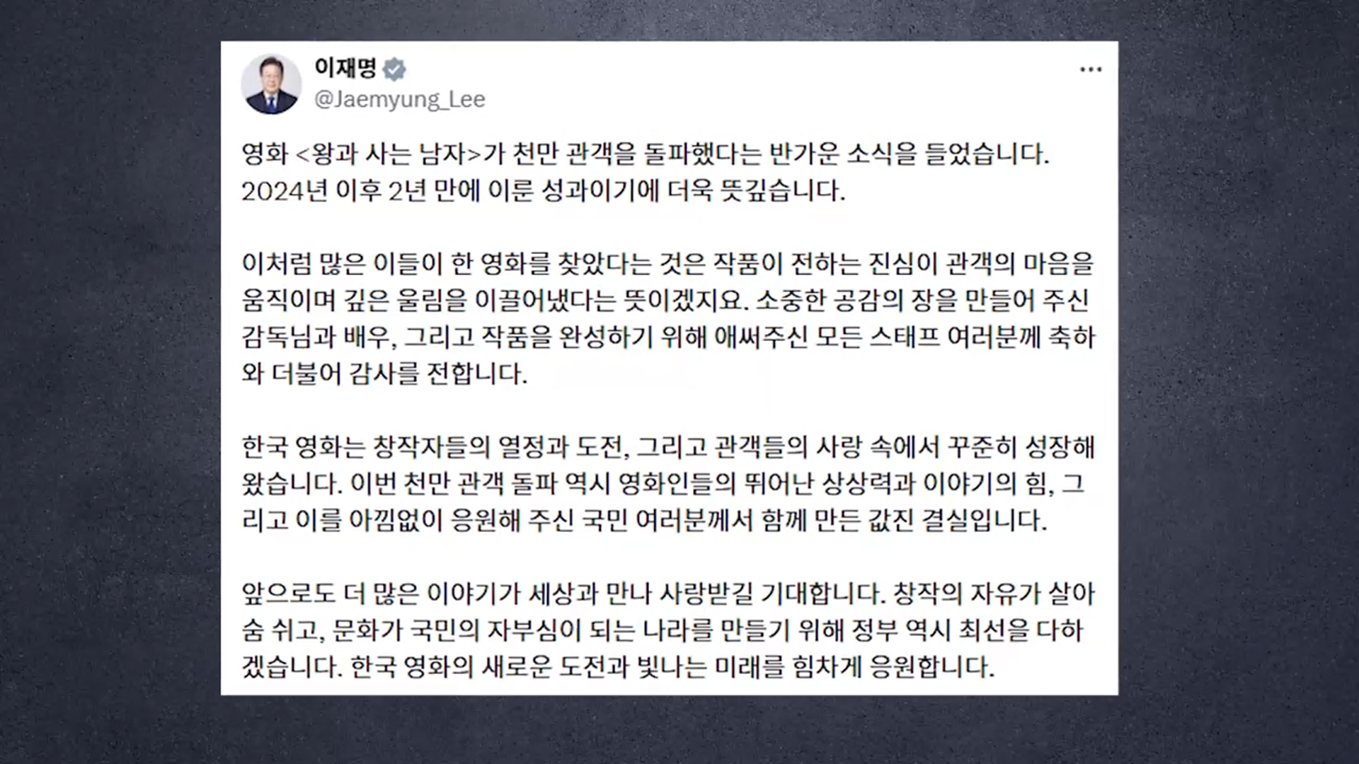 이재명 대통령이 영화 '왕과 사는 남자'의 천만 관객 돌파에 대해 "2024년 이후 2년 만에 이룬 뜻깊은 성과"라고 밝혔습니다.
