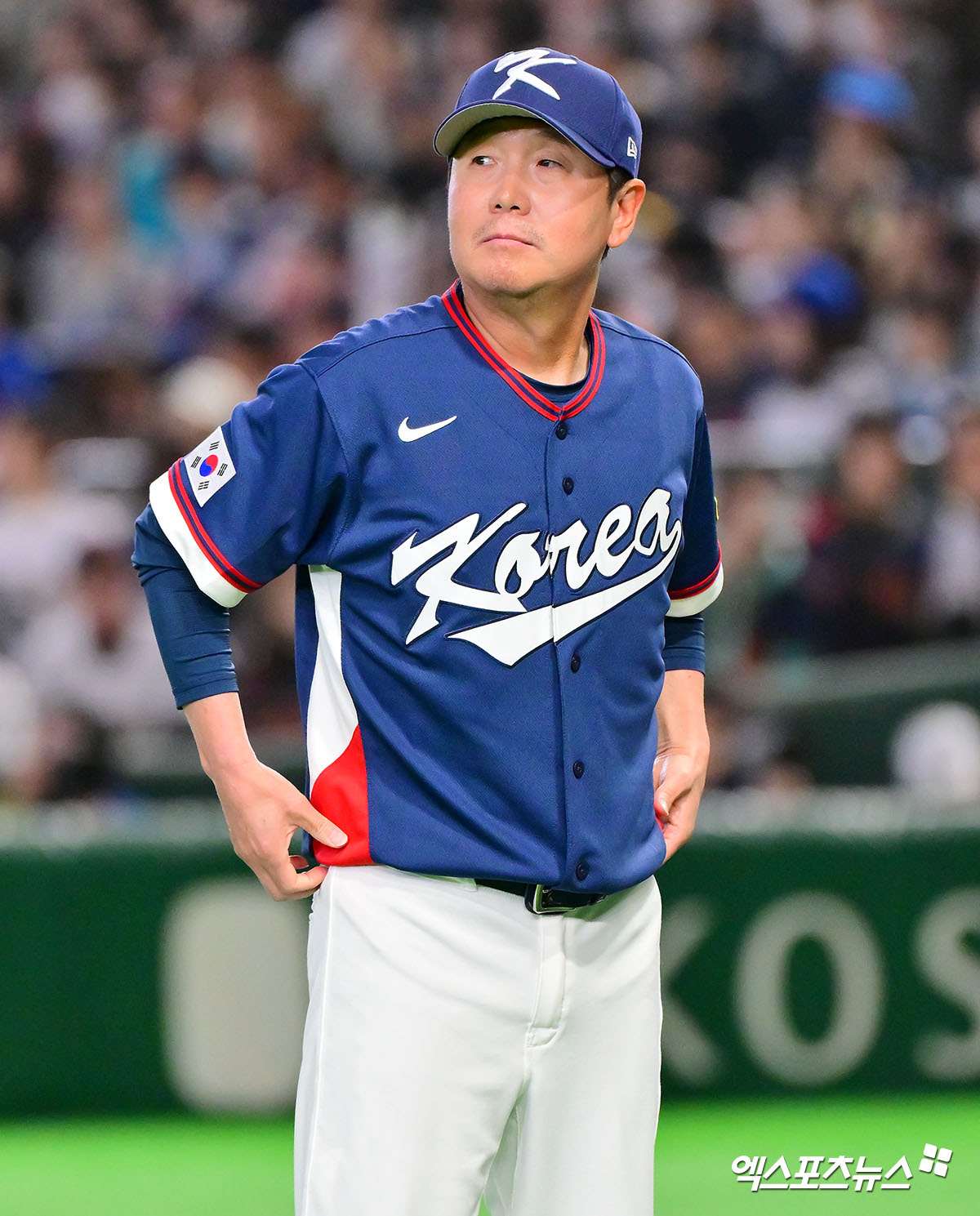 (엑스포츠뉴스 도쿄(일본), 김한준 기자) 7일 오후 일본 도쿄돔에서 열린 2026 월드베이스볼클래식(WBC) C조 한국과 일본의 경기, 한국 류지현 감독이 도열하고 있다.