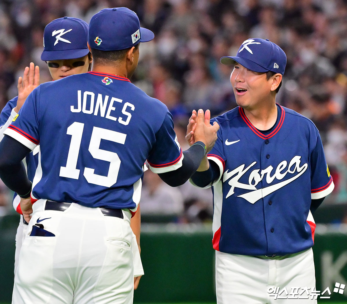 (엑스포츠뉴스 도쿄(일본), 김한준 기자) 7일 오후 일본 도쿄돔에서 열린 2026 월드베이스볼클래식(WBC) C조 한국과 일본의 경기, 한국 류지현 감독이 저메이 존스와 하이파이브를 하고 있다.
