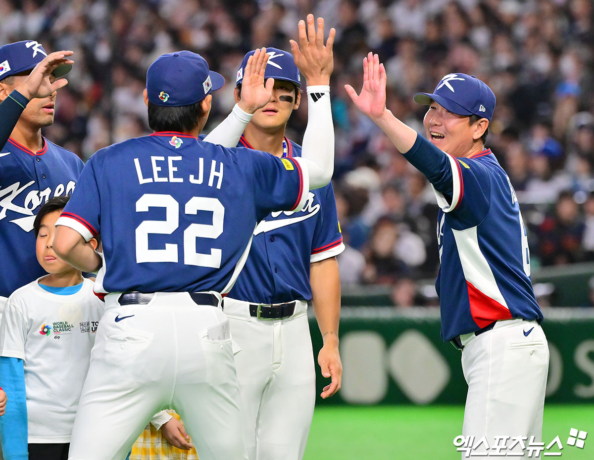 (엑스포츠뉴스 도쿄(일본), 김한준 기자) 7일 오후 일본 도쿄돔에서 열린 2026 월드베이스볼클래식(WBC) C조 한국과 일본의 경기, 한국 류지현 감독이 이정후와 하이파이브를 하고 있다.