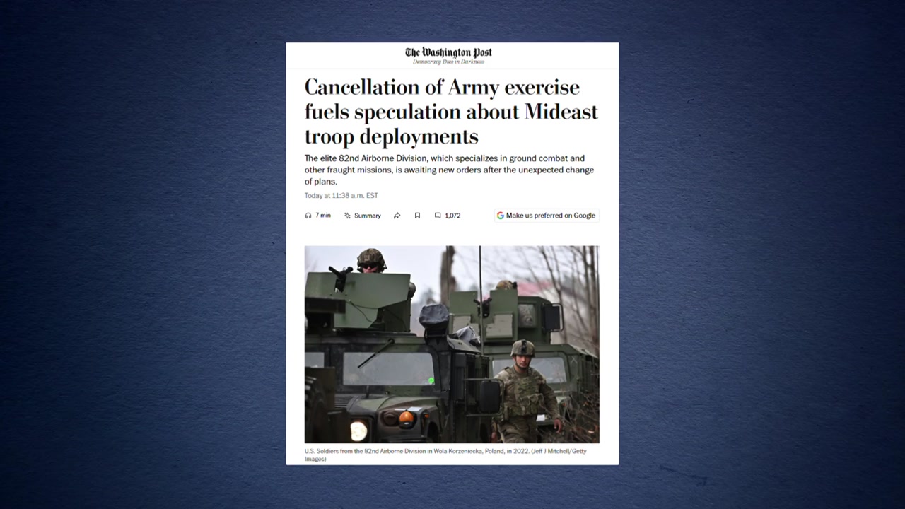 워싱턴포스트 현지시간 6일 지상 전투와 특수 임무를 전문으로 하는 제82공수사단에서 작전의 계획과 실행을 조정하는 핵심 본부 부대의 훈련이 취소됐다고 보도했습니다.