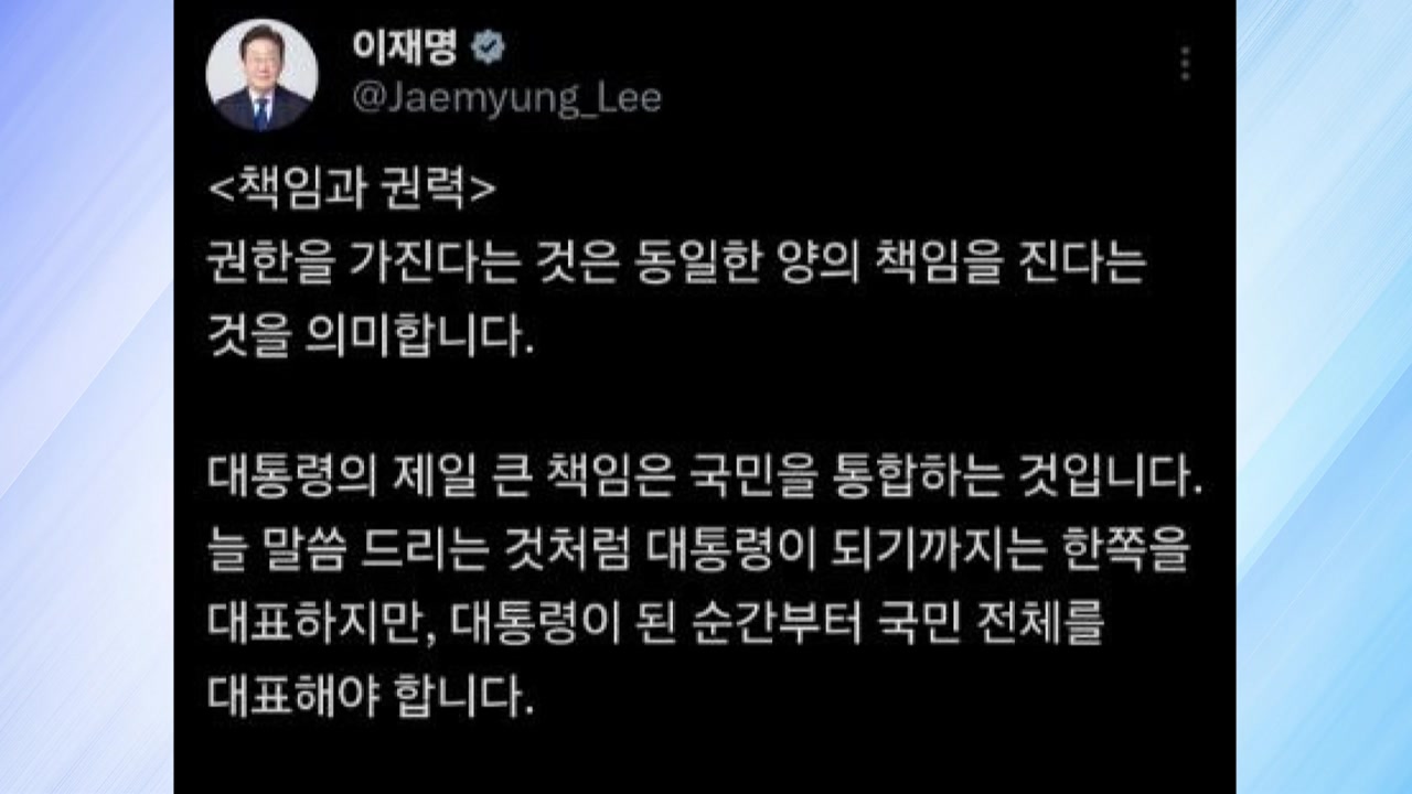 이 대통령은 어제(7일) SNS에 대통령이 되기까지는 한쪽을 대표하지만, 대통령이 된 순간부터는 국민 전체를 대표해야 한다며, 대통령의 제일 큰 책임은 국민을 통합하는 것이라고 적었습니다.