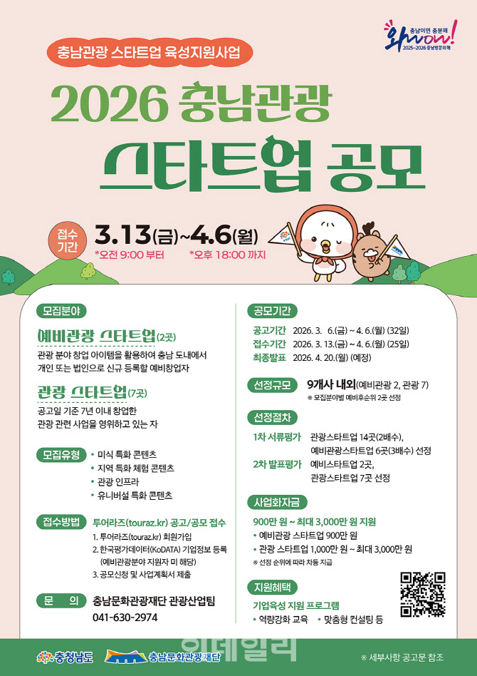 충남문화관광재단(대표이사 이기진)은 오는 4월 6일까지 ‘2026 충남관광 스타트업 육성지원사업’에 참여할 기업을 공개 모집한다고 밝혔다. 관광산업의 혁신 아이디어를 가진 창업기업과 예비 창업자를 발굴해 지역 관광 생태계를 강화하겠다는 취지다.