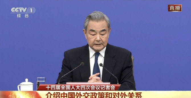 왕이 중국 외교부장이 8일 외교 주제 기자회견에서 발언하고 있다. (사진=중국 CCTV 화면 갈무리) |