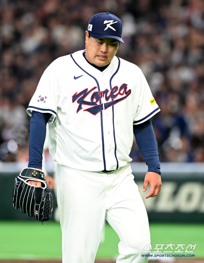 8일 일본 도쿄돔에서 열린 WBC(월드베이스볼클래식) 한국과 대만의 경기, 2회초 대만 장위청에 선제 솔로홈런을 허용한 뒤 이닝을 마친 류현진이 더그아웃으로 향하고 있다. 도쿄(일본)=허상욱 기자wook@sportschosun.com/2026.03.08/ |
