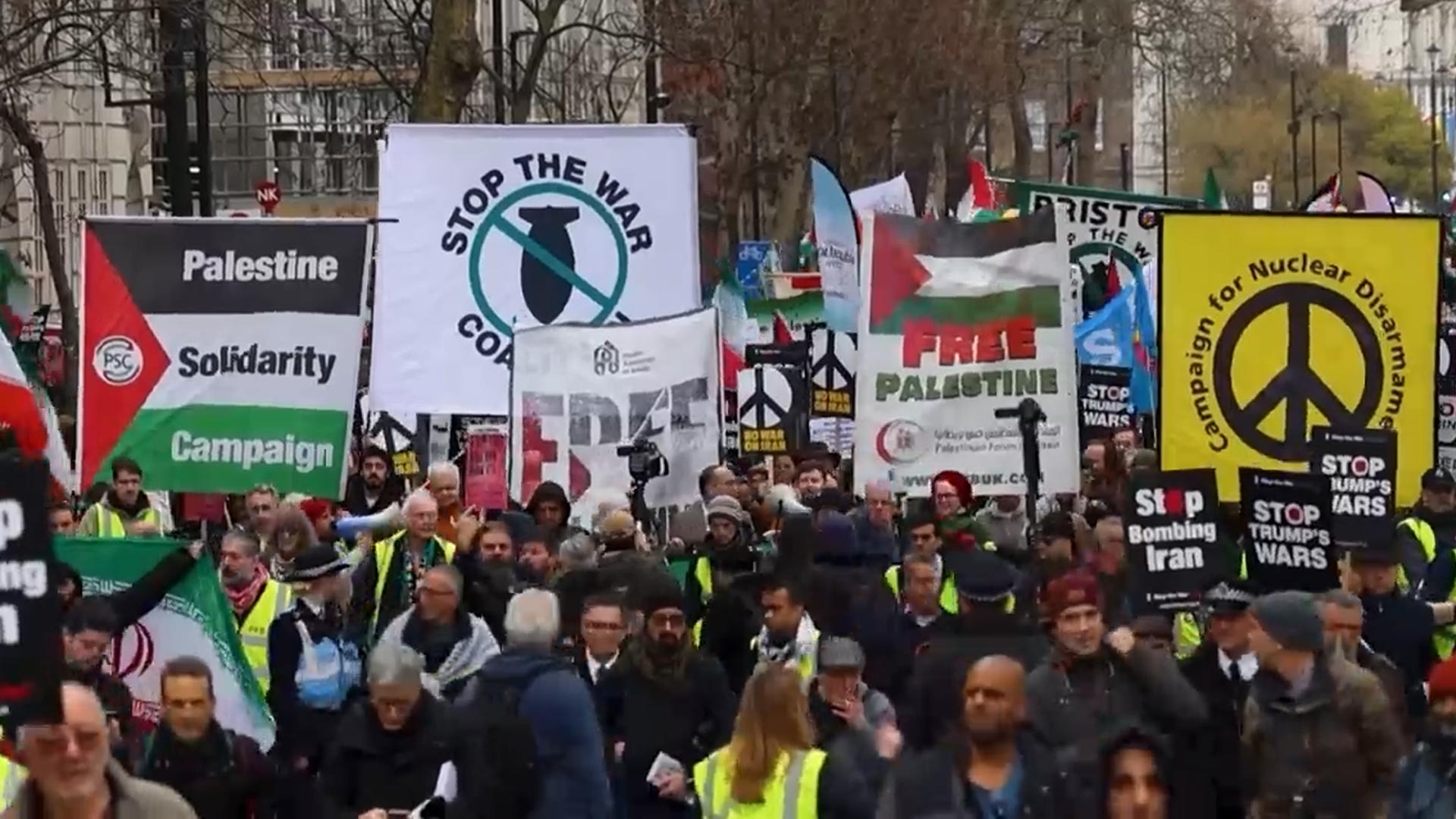 4천여 명의 시위대는 이란 폭격을 중단하라, 전쟁을 멈추라는 팻말을 들고 대사관 앞을 행진했습니다.