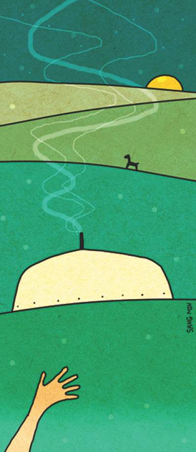 할아버지 가슴에서 홑겹의 게르 안에서 사람이 말하는 것처럼 웅얼웅얼 소리가 난다. 손톱만 한 작은 해가 천창 틀에서 빠져나가지 못하고 있다. 할아버지의 약해진 심장 멀리에서 소리가 난다.