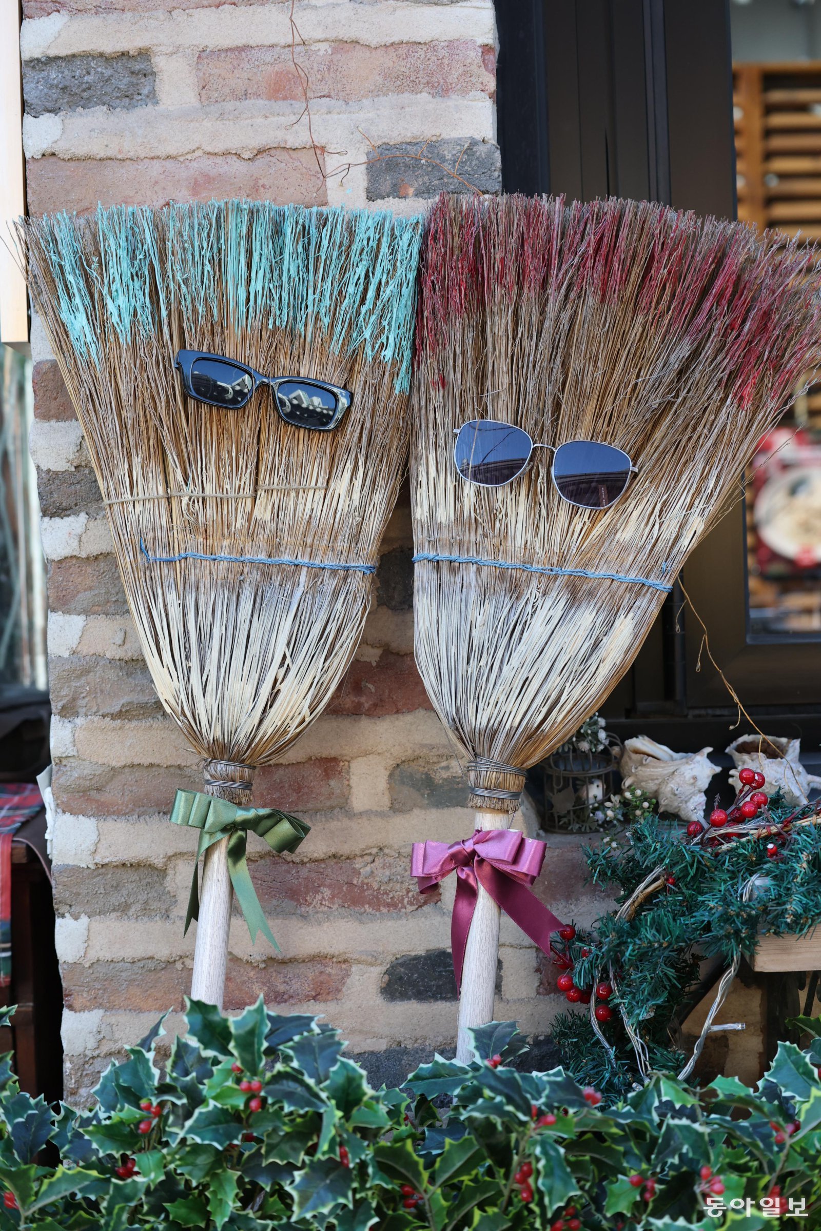 빗자루에 선글라스와 리본을 씌우니 한결 멋이 납니다. 마치 파티를 즐기러 가는 사람들 같네요. 평범한 일상 용품이 하나의 작품으로 변신했습니다.