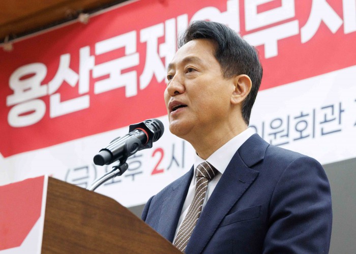 [서울=뉴스핌] 윤창빈 기자 = 오세훈 서울시장이 6일 오후 서울 여의도 국회 의원회관에서 열린 용산국제업무지구 '글로벌 허브'인가 '거대 베드타운'인가?' 정책 토론회에서 축사를 하고 있다. 2026.03.06 pangbin@newspim.com |