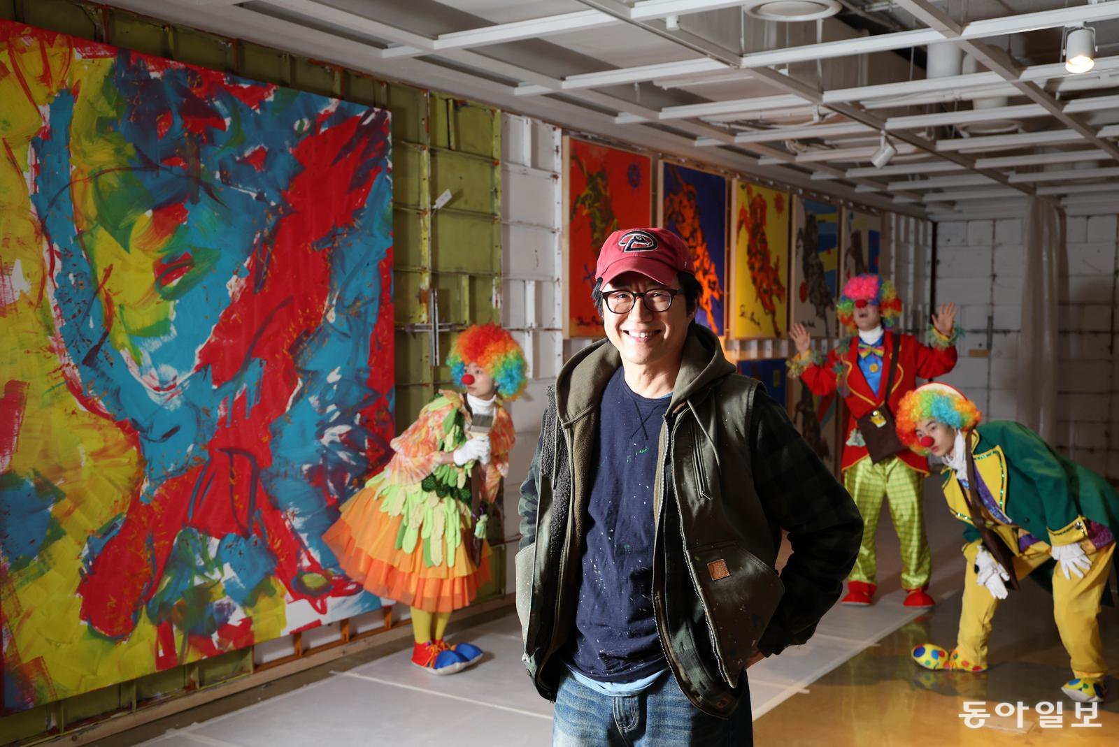 전시장은 박 배우의 작업실을 옮겨 놓은 듯, 그림뿐 아니라 포장된 작품이 쌓인 선반과 쓰다 남은 물감 등이 놓여 있었다. 여기에 화가가 자리를 비운 동안 ‘정령’들이 나타나 움직인다는 콘셉트를 도입해, 전시 내내 광대 분장을 한 배우 15명이 돌아다니며 연기를 한다. 박 배우는 “연극을 보는 건지, 전시를 보는 건지 헷갈리는 상황을 만들고 싶었다”고 했다.