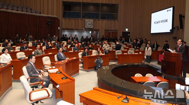 [서울=뉴시스] 조성봉 기자 = 송언석 국민의힘 원내대표가 9일 오후 서울 여의도 국회에서 열린 의원총회에서 발언을 하고 있다. 2025.03.09. suncho21@newsis.com
