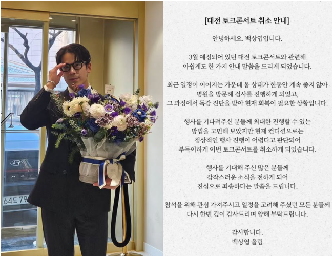끝으로 그는 “행사를 기대해 주신 많은 분들께 갑작스러운 소식을 전하게 되어 진심으로 죄송하다는 말씀을 드린다”고 전했다.