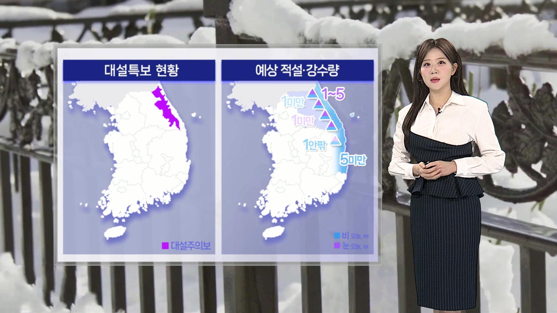 밤까지 강원과 경북 산지에, 내일 새벽까지 경북 동해안에 눈 또는 비가 이어지겠습니다.