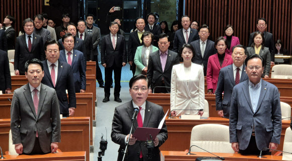 결의문은 장동혁 대표를 포함한 의총 참석 의원 모두 기립한 가운데 송언석 원내대표가 의총장 앞에서 대표로 낭독했다.