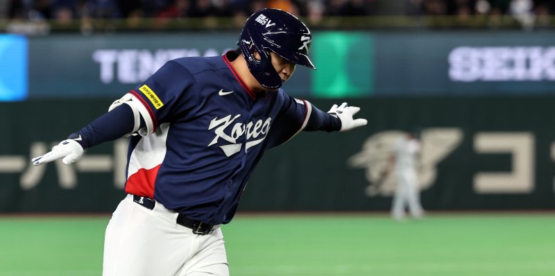 9일 일본 도쿄돔에서 열린 2026 월드베이스볼클래식 조별리그 C조 대한민국과 호주의 경기. 대한민국 문보경이 2회초 무사 1루 투런홈런을 친 뒤 그라운드를 돌고 있다.뉴스1 |