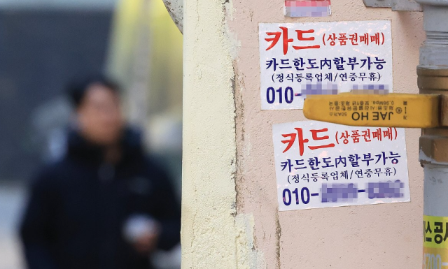 5일 서울 명동 골목에 카드대출 관련 광고물이 부착되어 있다 |