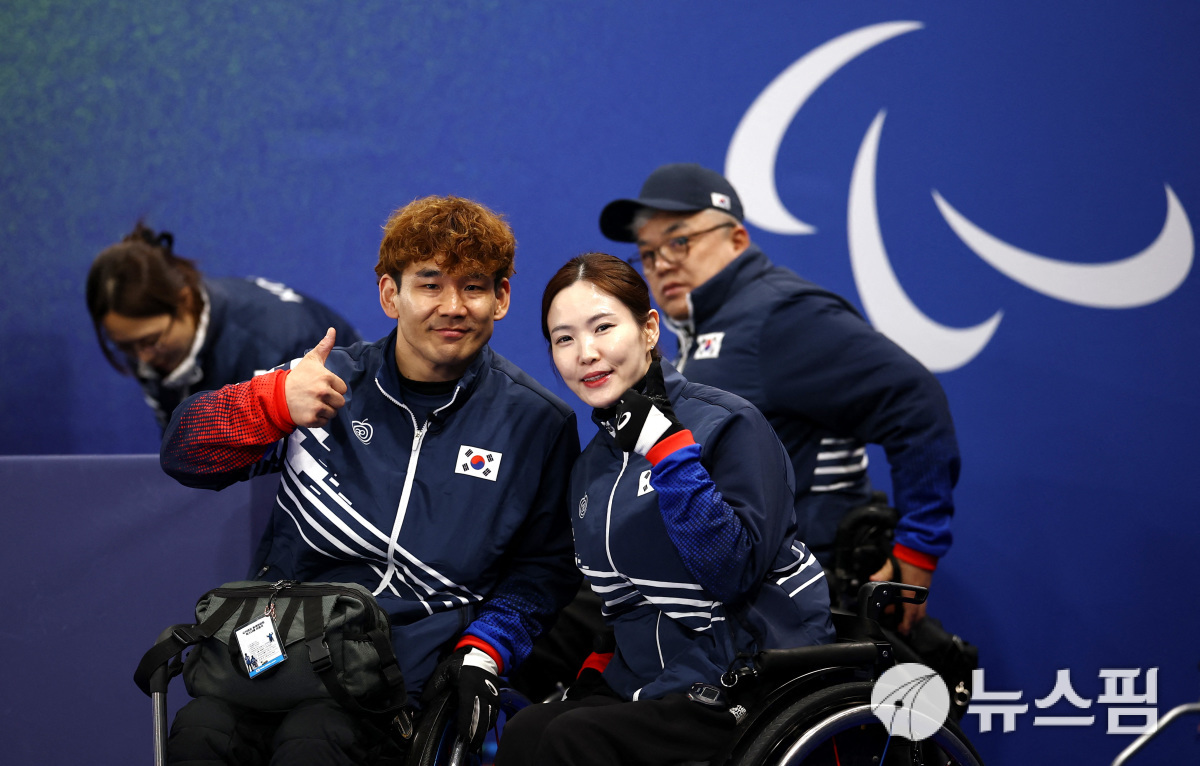 [코르티나담페초 로이터=뉴스핌] 한국 휠체어컬링 대표팀 백혜진-이용석이 9일(한국 시간) 이탈리아 코르티나담페초의 코르티나 컬링 올림픽 스타디움에서 열린 2026 밀라노·코르티나담페초 동계패럴림픽 예선 최종 7차전에서 에스토니아를 10-0으로 꺾은 뒤 포즈를 취하고 있다. 2026.03.10 wcn05002@newspim.com |