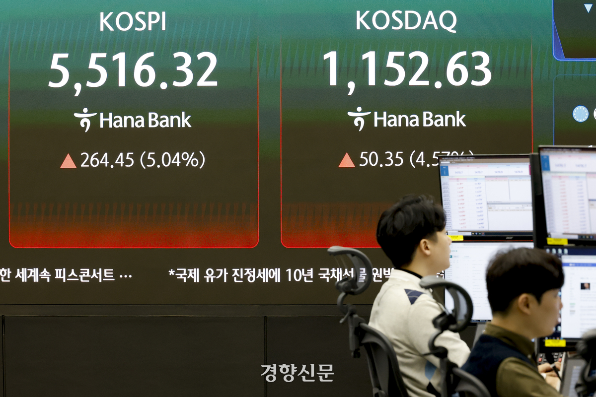 이날 코스피는 전장보다 271.34포인트(5.17%) 오른 5523.21에 개장했다. 전날 급락한 삼성전자(6.86%), SK하이닉스(7.89%) 등 반도체주가 크게 반등하며 지수를 견인하고 있다.