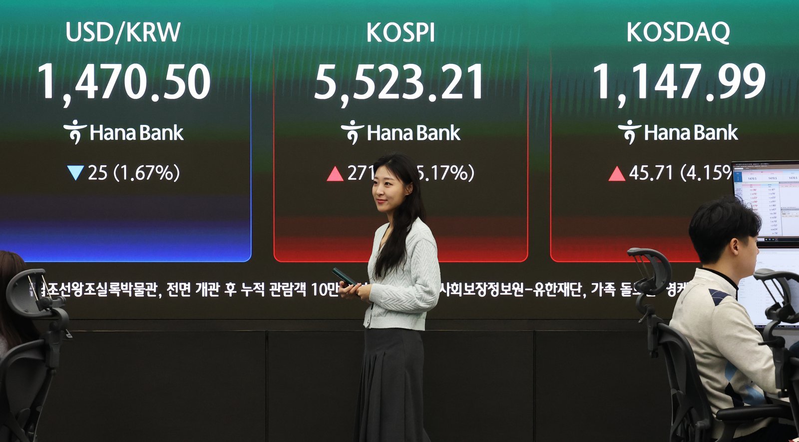 코스피가 급등하며 매수 사이드카가 발동한 10일 오전 서울 중구 하나은행 딜링룸 전광판에 코스피 시황이 표시되고 있다. 이날 코스피는 전 거래일 대비 5.17% 오른 5523.21, 코스닥은 4.15% 오른 1,147.99, 원·달러환율은 24.7원 내린 1470.8원에 개장했다. 2026.3.10/뉴스1 |