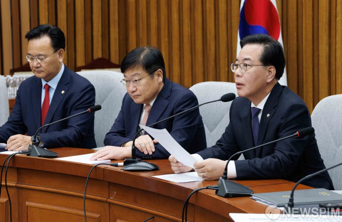 [서울=뉴스핌] 윤창빈 기자 = 송언석 국민의힘 원내대표가 10일 오전 서울 여의도 국회에서 열린 원내대책회의에서 모두발언을 하고 있다. 2026.03.10 pangbin@newspim.com |