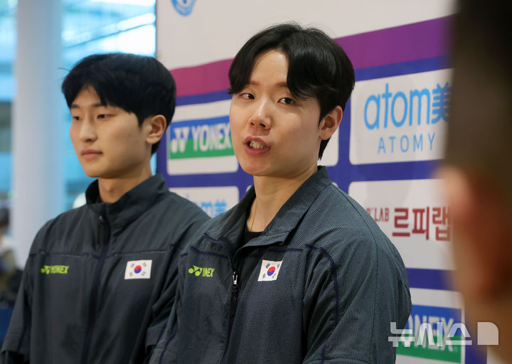 [인천공항=뉴시스] 홍효식 기자 = 세계배드민턴연맹(BWF) 월드투어 슈퍼1000 전영오픈 남자 복식 결승에서 2연패를 달성한 김원호(왼쪽)와 서승재가 10일 인천국제공항 제2터미널로 귀국해 취재진 질문에 답하고 있다. 2026.03.10. yesphoto@newsis.com