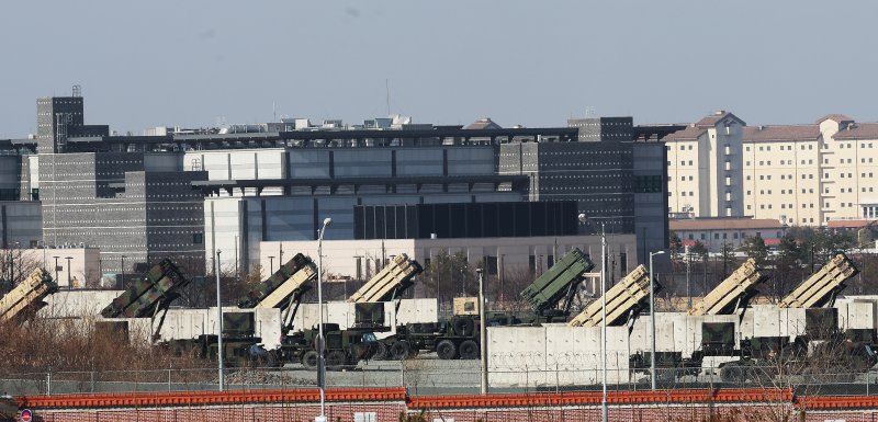 '자유의 방패' 훈련 시작 한미 연합연습 '자유의 방패' 훈련을 하루 앞둔 지난 8일 경기 평택 주한미군기지 캠프 험프리스에 방공 무기체계인 패트리엇 미사일이 배치돼 있다. 뉴스1 |