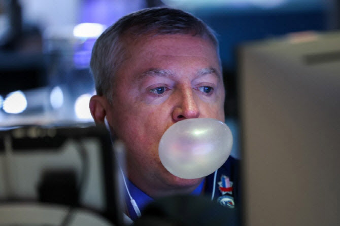 한 트레이더가 뉴욕 증권거래소(NYSE)에서 껌 풍선을 불며 거래를 하고 있다. (사진=AFP)