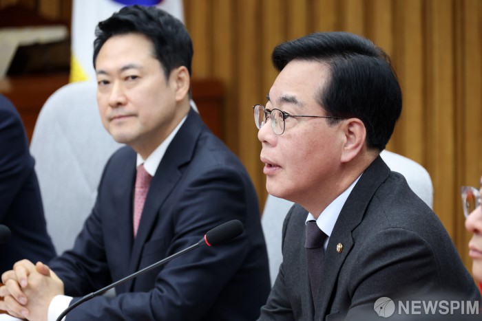 [서울=뉴스핌] 정일구 기자 = 송언석 국민의힘 원내대표가 11일 오전 서울 여의도 국회에서 열린 지역발전 영입 인재 환영식에서 발언하고 있다. 2026.03.11 mironj19@newspim.com