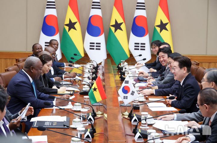 [서울=뉴시스]고범준 조재완 기자 = 이재명 대통령이 11일 존 드라마니 마하마 가나 대통령과 정상회담을 갖고 "앞으로 양국 간 국민들 교류가 더욱 늘어나서 한국과 가나의 관계가 여러 방면에서 더욱 단단해지기를 기대한다"고 말했다.