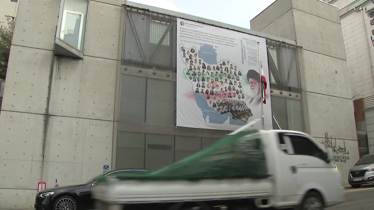 주한이란대사관이 건물 외벽에 미국과 이스라엘의 공습으로 목숨을 잃은 아야톨라 알리 하메네이 전 최고지도자 사진을 내걸었습니다.
