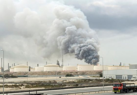 9일(현지시간) 바레인 시트라 섬에 위치한 국영 석유회사인 '밥코에너지' 정유소에서 연기가 피어오르는 모습/사진=로이터